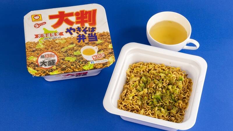 麺の重量が通常の「やきそば弁当」の1.3倍という大盛り仕様で、特製中華スープが付いています。やきそば弁当では物足りない人に向けた一品です。