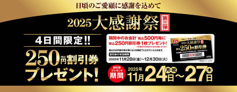 期間中の会計※税込500円毎に税込250円割引券を1枚プレゼント