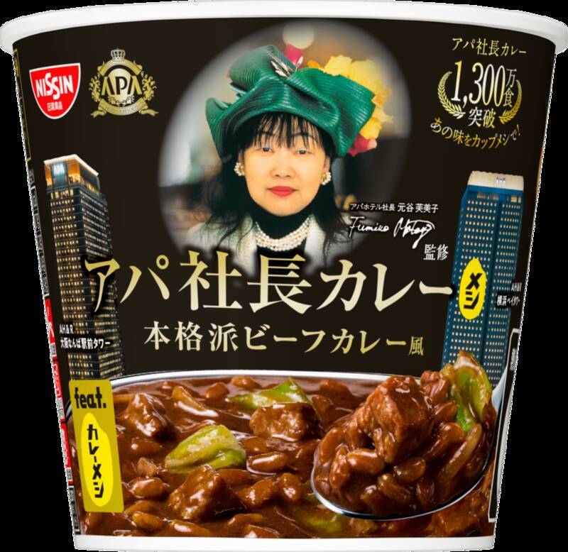 パッケージは、「アパ社長カレー」をイメージしたデザインで、アパホテル社長・元谷 芙美子 (もとや ふみこ) 氏の顔写真をあしらった、インパクトのある一杯だ。