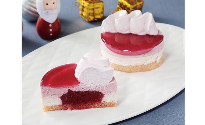 ベリースポンジに、なめらかなバニラクリーム、ベリージュレ、ベリームースを重ね、ベリークリームと艶やかなグラサージュで仕上げたというケーキです。