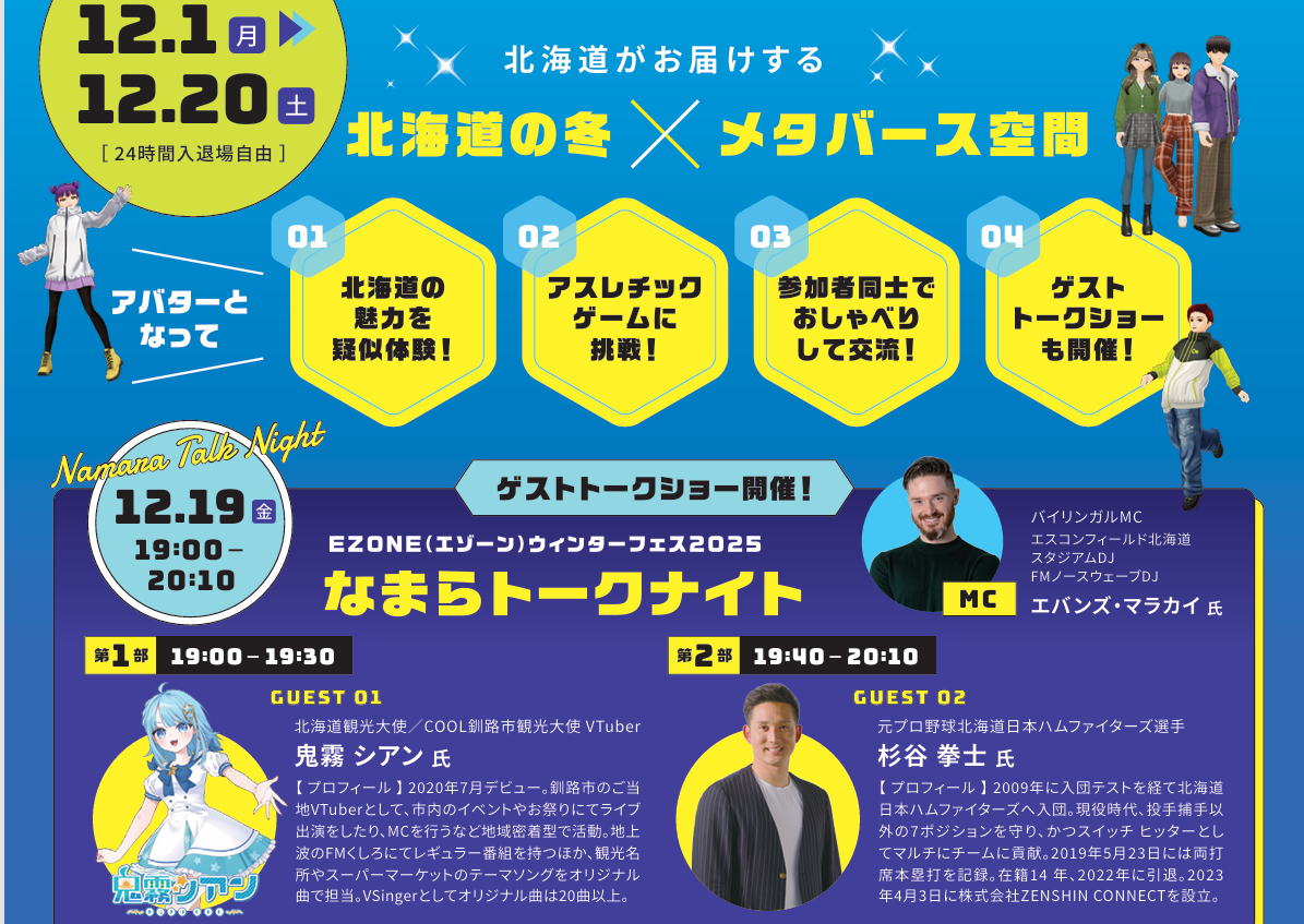 本イベントは、2025年12月1日(月)~12月20日(土)の20日間開催され、北海道の冬の魅力をメタバース空間で体験することができます。