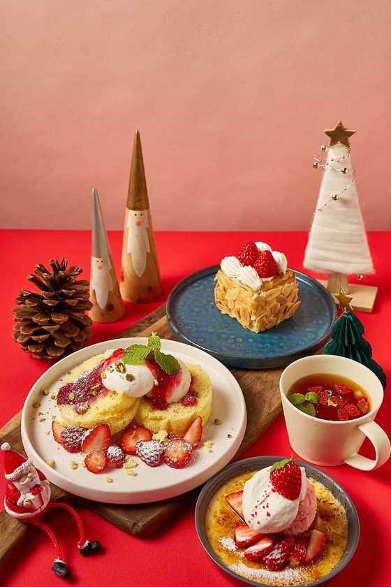 やわらかなパンケーキにオリジナルのいちごソースと生クリームを合わせ、ピスタチオとクランベリーソースで風味を添えた季節限定プレート。静岡県産いちごと粉糖を散らし、まるで雪が降り積もったような冬らしい仕上がりに。甘みのあるパンケーキと生クリームに、いちごとクランベリーの甘酸っぱさが心地よく広がる、クリスマスだけの特別な一皿です。