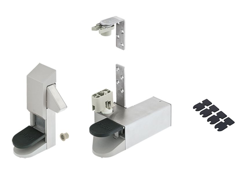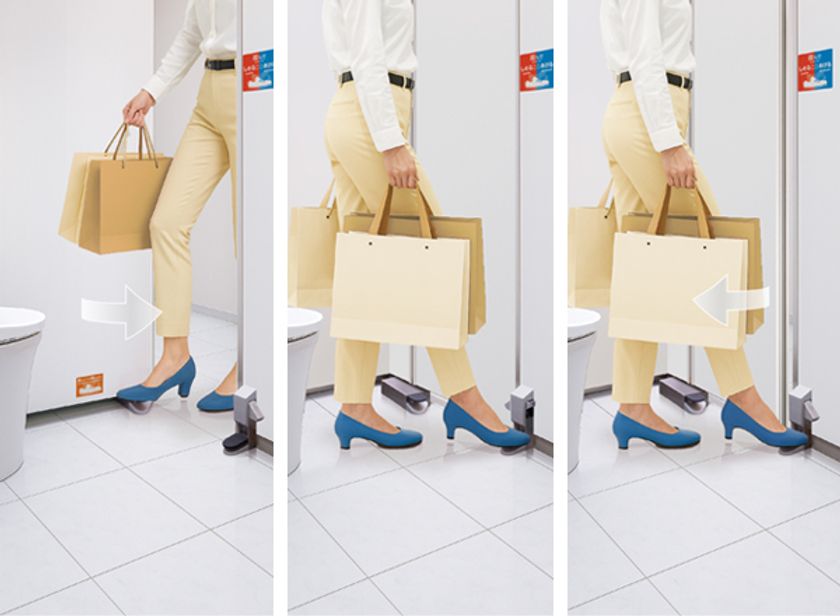ラバトリー製品ハンズフリードアシステム「フムロック・フムヒンジ」は、トイレのドアや錠前に手で触れることなく、足の操作のみで個室に出入りが可能なトイレブースドアシステムです。