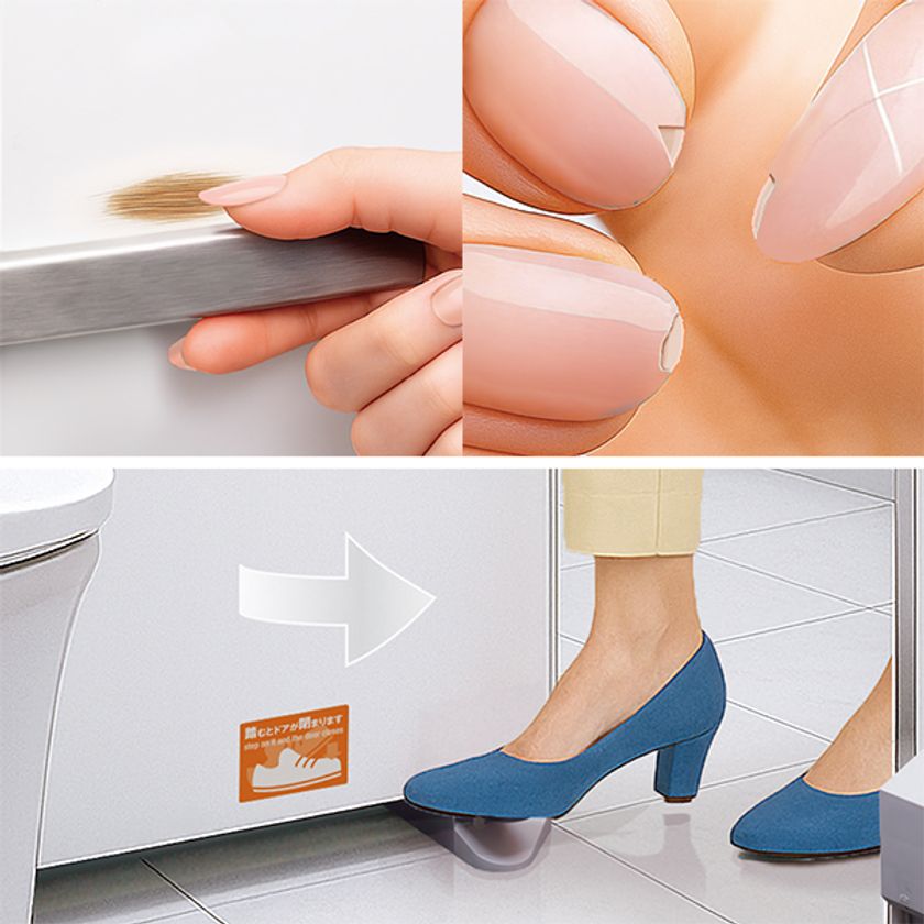 また、錠(スライドボルト)の操作で爪(ネイル)とドア表面が接触し爪(ネイル)がキズつくことを気にする女性もいると聞きます。「フムロック」は足で操作するため、この心配が無くなります。