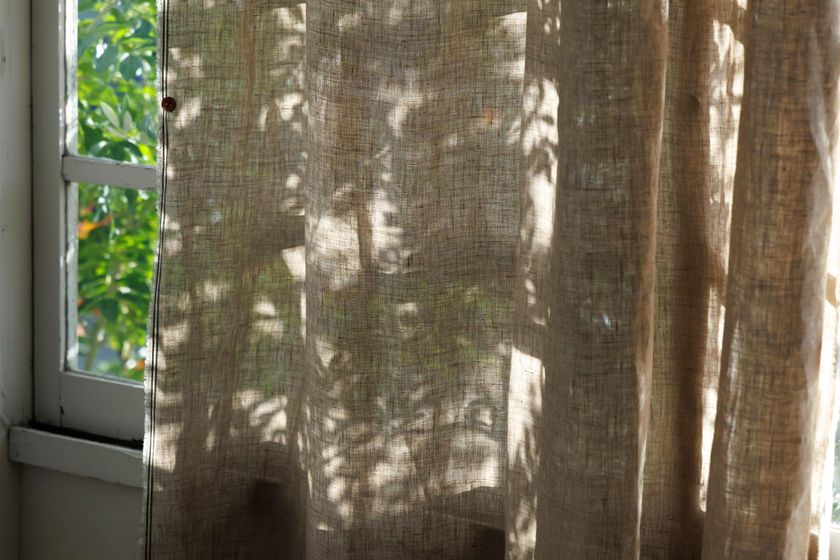 廃棄生地ゼロを目指しKURASIKUのカーテンにはプラスチックフックがなく、生地上部に空いた8つのホールに布紐を通して掛けるスタイル(特許取得済)です。使用生地を最小限に抑えるためにヒダやタッセルもなく廃棄生地が出ない製造方法で生産されています。(弊社のオーダーカーテンの製造ラインでは毎日450kg、年間162トンもの生地が廃棄されています。そのためKURASIKUはオーダーではなく既製サイズに限定して生産しています)