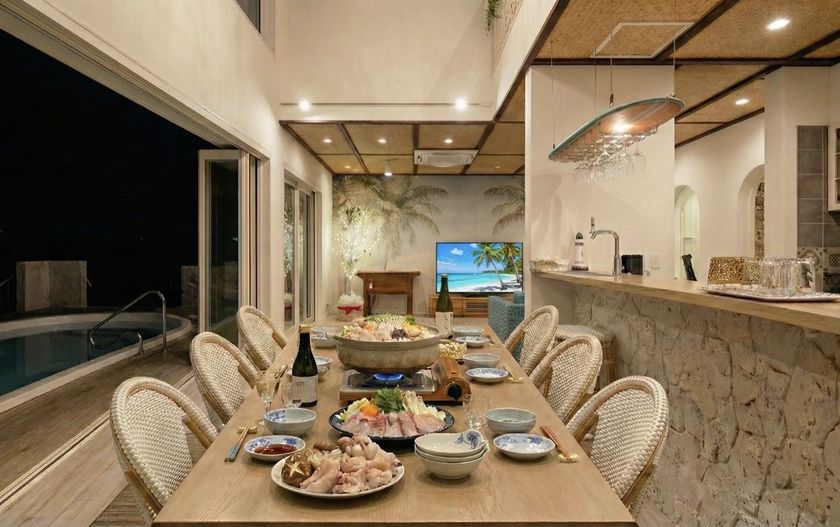 「Hale Kotsubo」は、カラオケルーム、サウナルーム、屋外プールを備えた贅沢な貸し切り別荘。ハワイのマウイ島ヴィラをイメージしたインテリアの中で、何もしない時間も非日常の特別なひとときに彩ります。