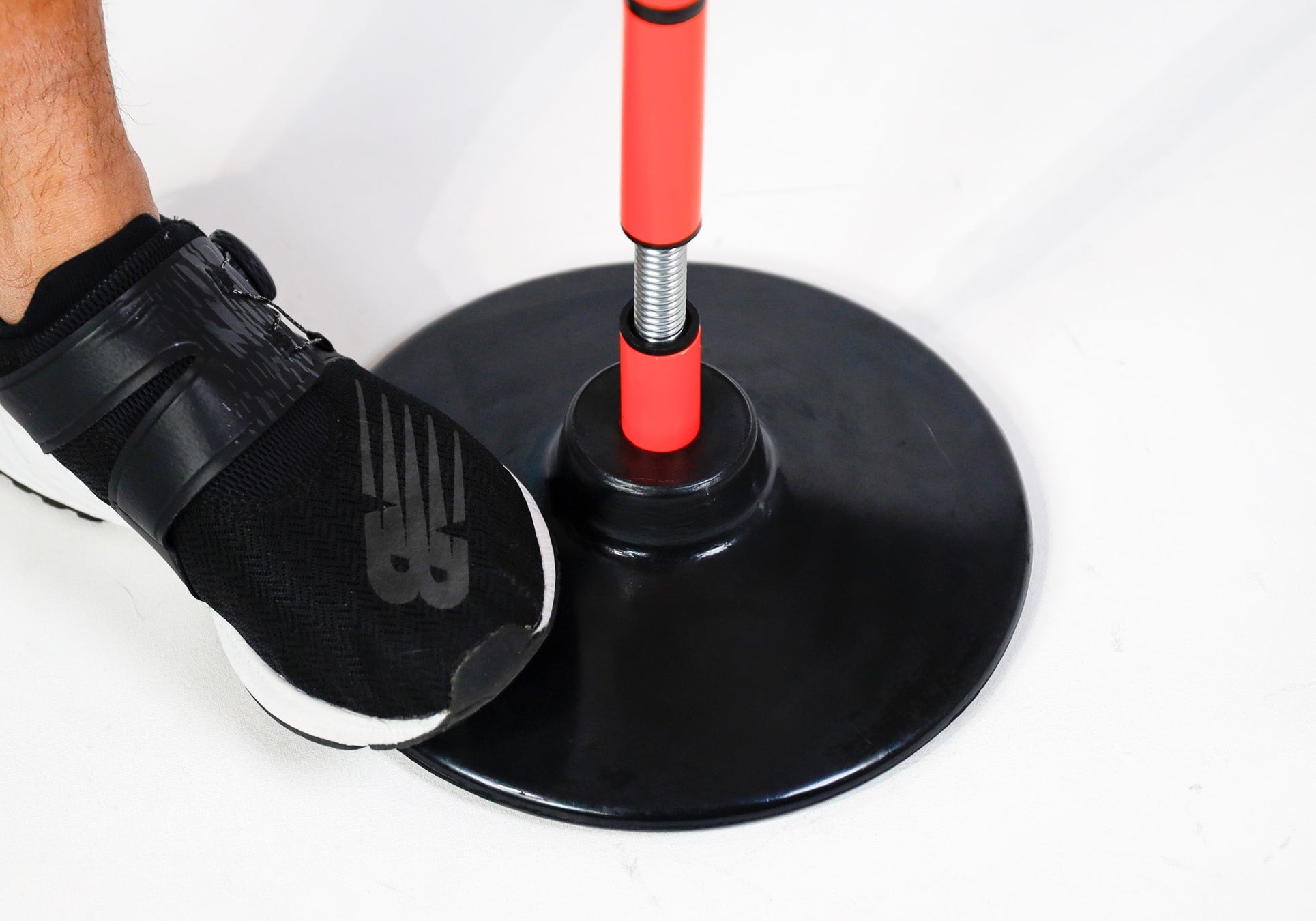 硬いゴム素材で作られた土台のため、重心がしっかりと安定し、屋内外どちらも使用可能。踏んでも割れず安心してご使用いただけます。一番稼働域のある先端部分には、厚さ4mmのウレタンフォームが施されており、反動で跳ね返ってきたポールが接触しても衝撃を吸収し、身体を保護します。