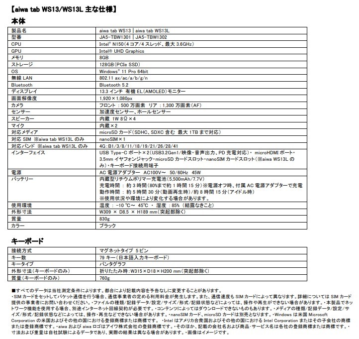 aiwa tab WS13:94,800円(税込)/aiwa tab WS13L:99,800円(税込)