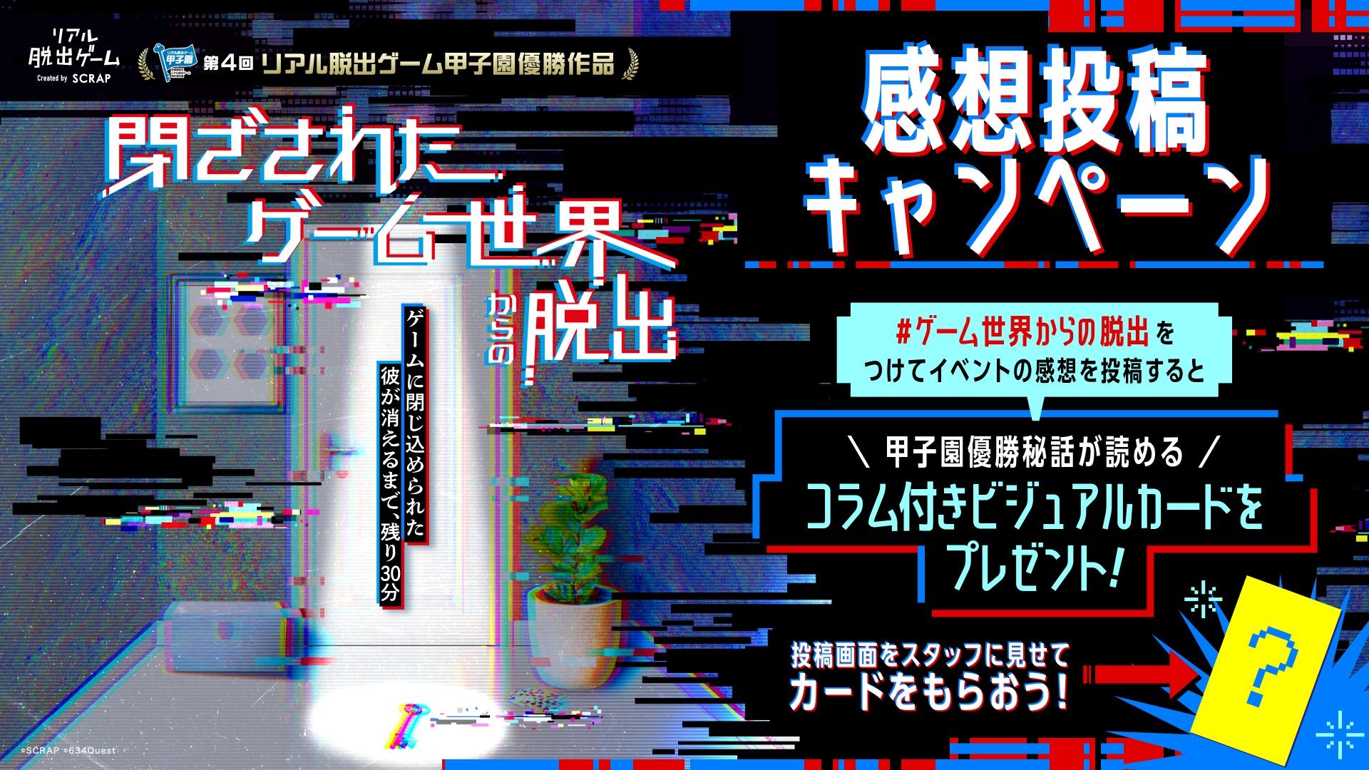 全世界で累計1,490万人以上を動員しているリアル脱出ゲームを企画制作する株式会社SCRAP(本社:東京都渋谷区、代表:加藤隆生)は、全国高校生リアル脱出ゲーム制作選手権(通称「リアル脱出ゲーム甲子園」)第4回優勝作品を、共同でリメイクした『閉ざされたゲーム世界からの脱出』のメインビジュアルを公開します。また、開催を記念した感想投稿キャンペーンも実施します。