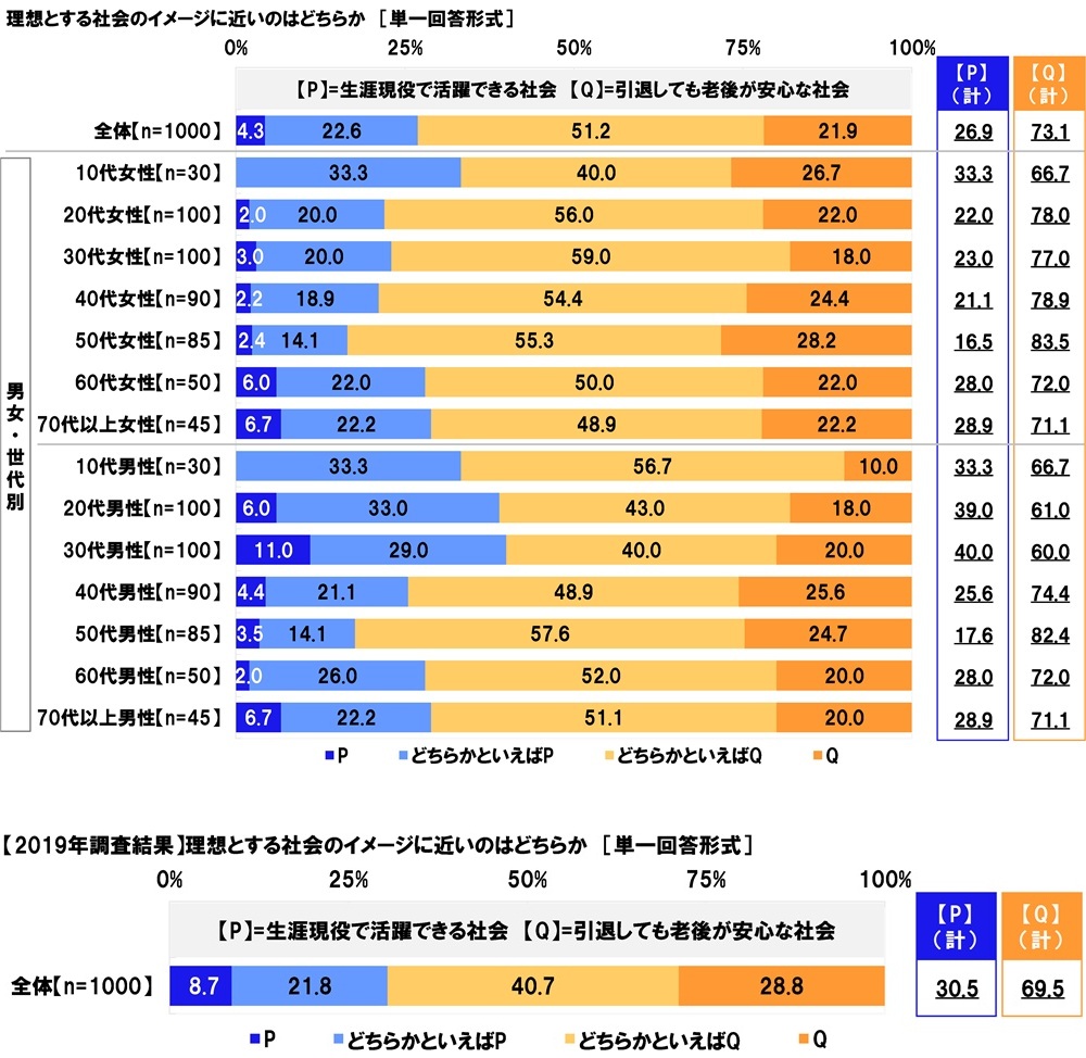 過去の調査結果と比較すると、2019年調査では【生涯現役で活躍できる社会】は30.5%、【引退しても老後が安心な社会】は69.5%となっており、今回の調査では2019年調査とおおむね同様の傾向となりました。