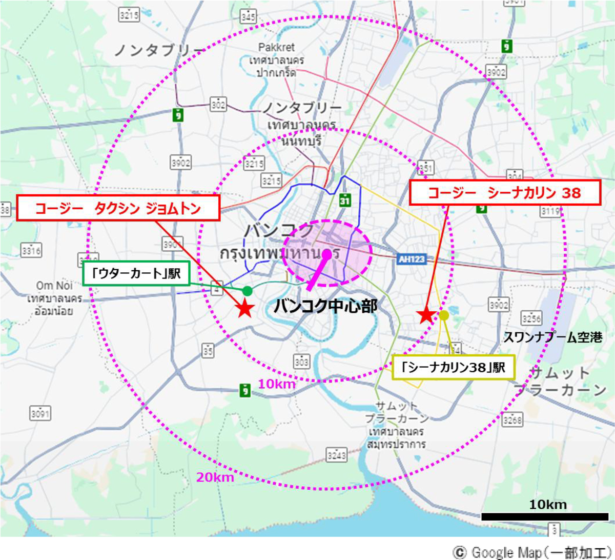 ◆タイ・バンコク中心部から見た『コージー シーナカリン38』『コージー タクシン ジョムトン』の位置図