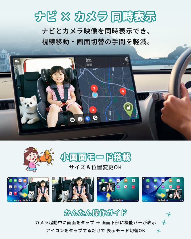 既存のカーナビ画面で「後部座席を見守る」という新発想。Cabin Careは、後部座席の様子を撮影する専用カメラとワイヤレスCarPlayアダプターを組み合わせた2in1の車内見守りシステムです。既存のカーナビ画面に後部座席の映像をリアルタイム表示でき、画面を切り替えることなく、前を向いたままお子さまの様子を確認できます。