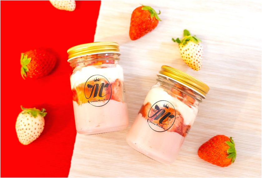 苺ティラミスクリームと、ミルクティラミスクリームを瓶に注ぎ込み、仕上げに真っ赤な栃木県産とちあいかと、真っ白な栃木県産ミルキークイーンの角切りをトッピングした、見た目にもおめでたいティラミスに仕立てました。年末年始のお手土産におすすめです。