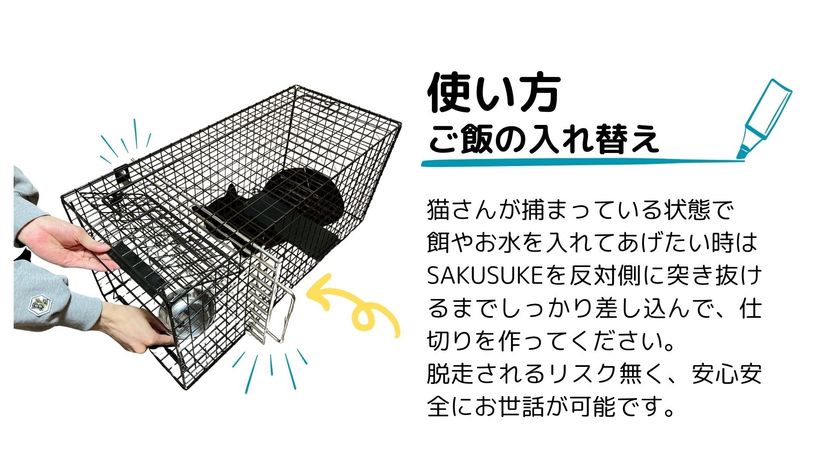 捕獲された猫を逃がすことなく、餌やお水を入れたいときに使用します。トラスケの扉を開いても捕獲した猫が脱走できない状態を作れるので、リスク無く安心安全にお世話することが可能になります。