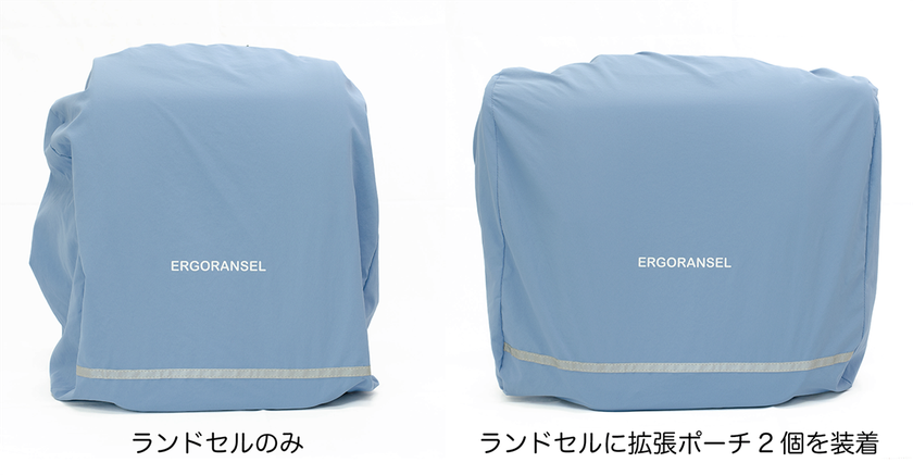 専用の拡張ポーチの取付が出来るエルゴランセルの特徴に対応した、専用レインカバーを開発しました。