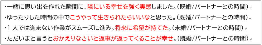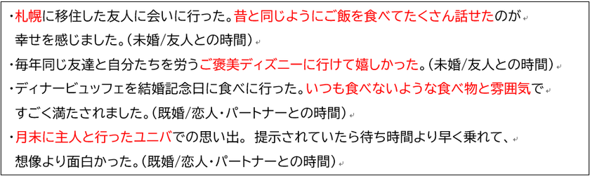 一方、女性のコメントからは、大切なひとの対象がパートナーに限らず、友人との久しぶりの再会や特別な記念日の食事、ふたりでの思いがけない楽しい時間など、「非日常の出来事やイベント」を通して深い満足感や喜びを感じているようです。