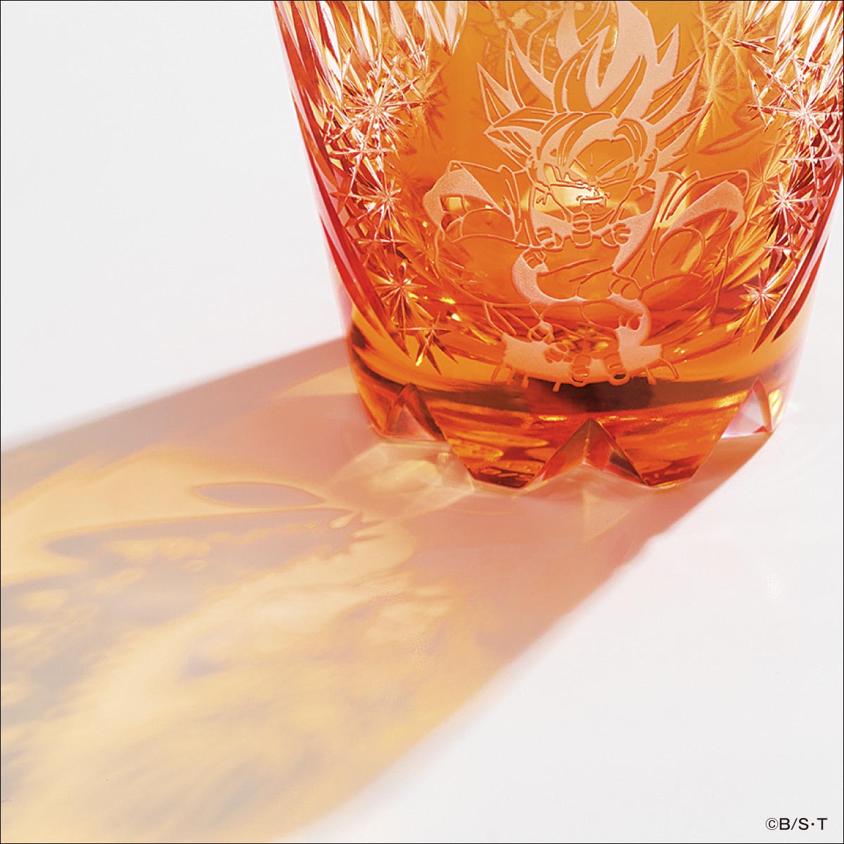 力強いオレンジの色被せ硝子に、超サイヤ人になった孫悟空が必殺技を構える!その背景には超サイヤ人とドラゴンボールの星をイメージした吉祥紋「菊つなぎ文様」が熟練職人の手切りで施されました。グラスを上から見ると必殺技が輝いているかのように見える、下部の深いカットもポイント。