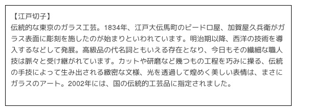 本品は、国の伝統的工芸品にも指定されている東京のガラス工芸「江戸切子」の熟練職人が、一点一点手作りで制作する高級グラスです。