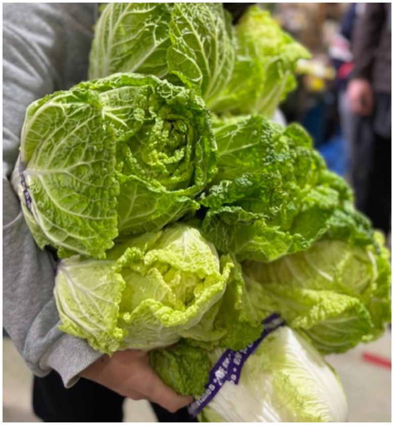 上州・村の駅の代名詞ともいえるド迫力イベント「抱え込み放題」1月は白菜で開催です。渋川市赤城町産のずっしりと重いみずみずしい巨大白菜を使用。制限時間30秒の間に白菜を抱え込めるだけ抱え込み、「せーの!」の合図で一気に持ち上げ!全身の力を込めて、持ち上げた瞬間に歓声が上がるほどの迫力と、みごと持ち上げた時の達成感が魅力で、毎回行列のできる人気イベントとなっています。