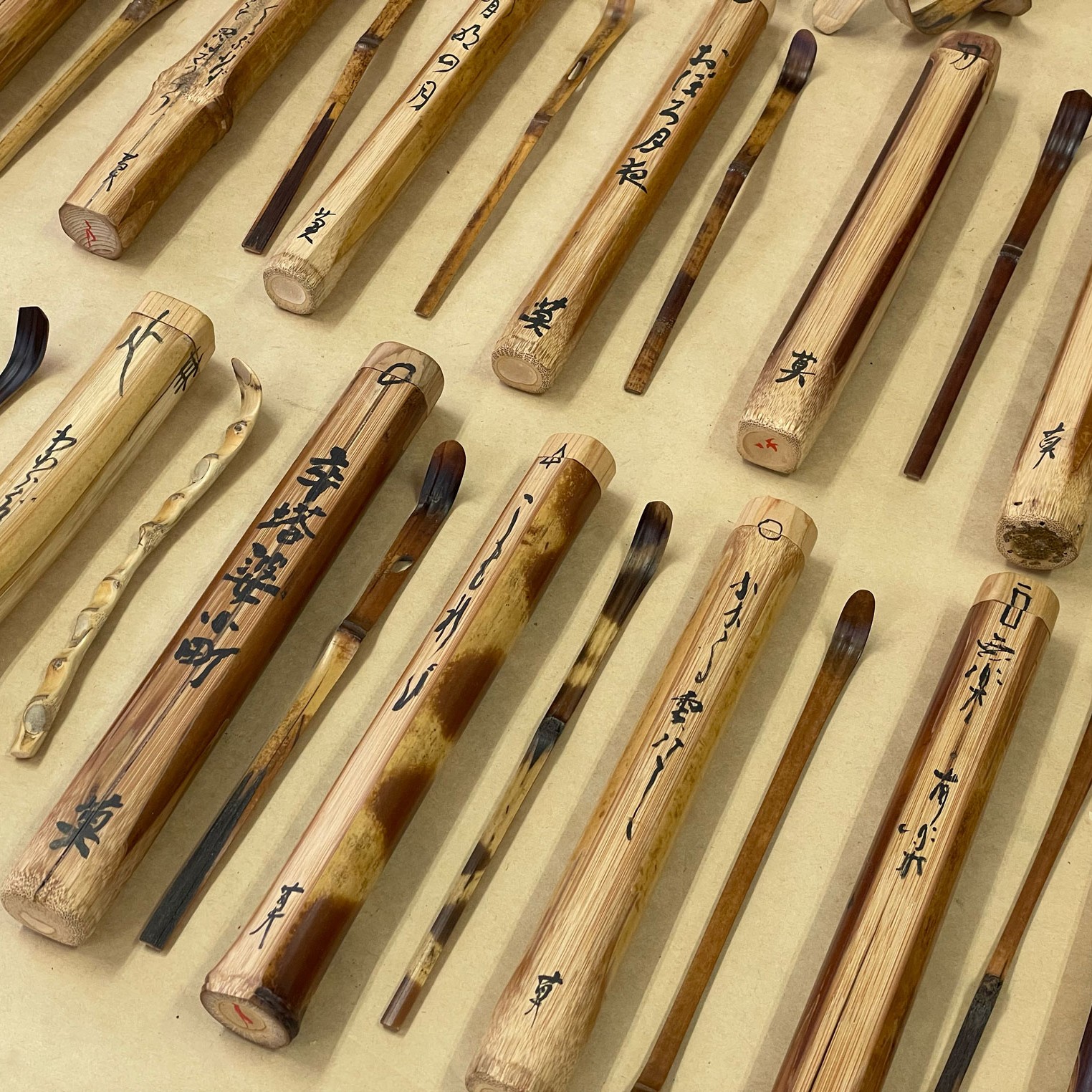 本展は、100年~600年の時を経て古民家の梁から取り出された貴重な「煤竹(すすたけ)」のみを用いた、茶杓創作の集大成です。