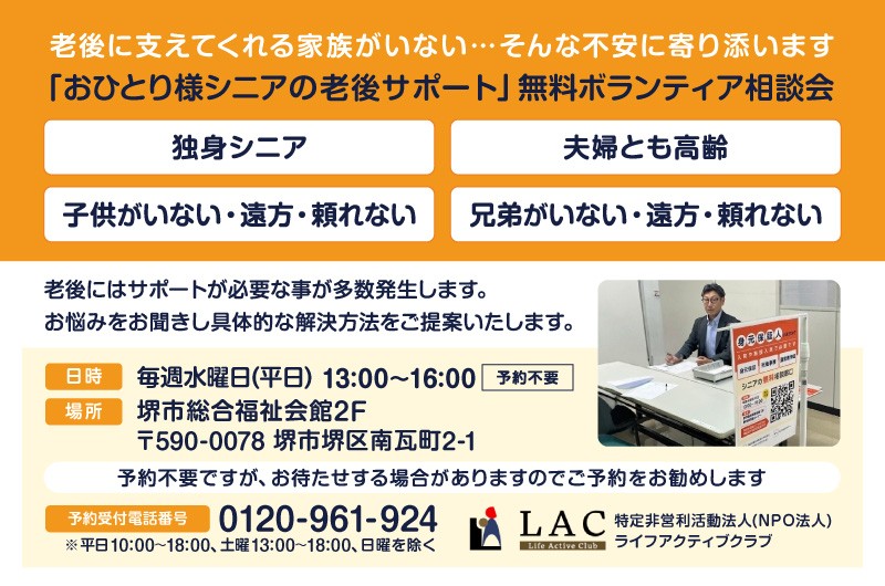 特定非営利活動法人(NPO法人)ライフアクティブクラブ(所在地:大阪府堺市、理事長:竹内信美)は、堺市総合福祉会館にて、「おひとり様シニア」を対象とした無料老後相談会(ボランティア)を開催することを決定しました。