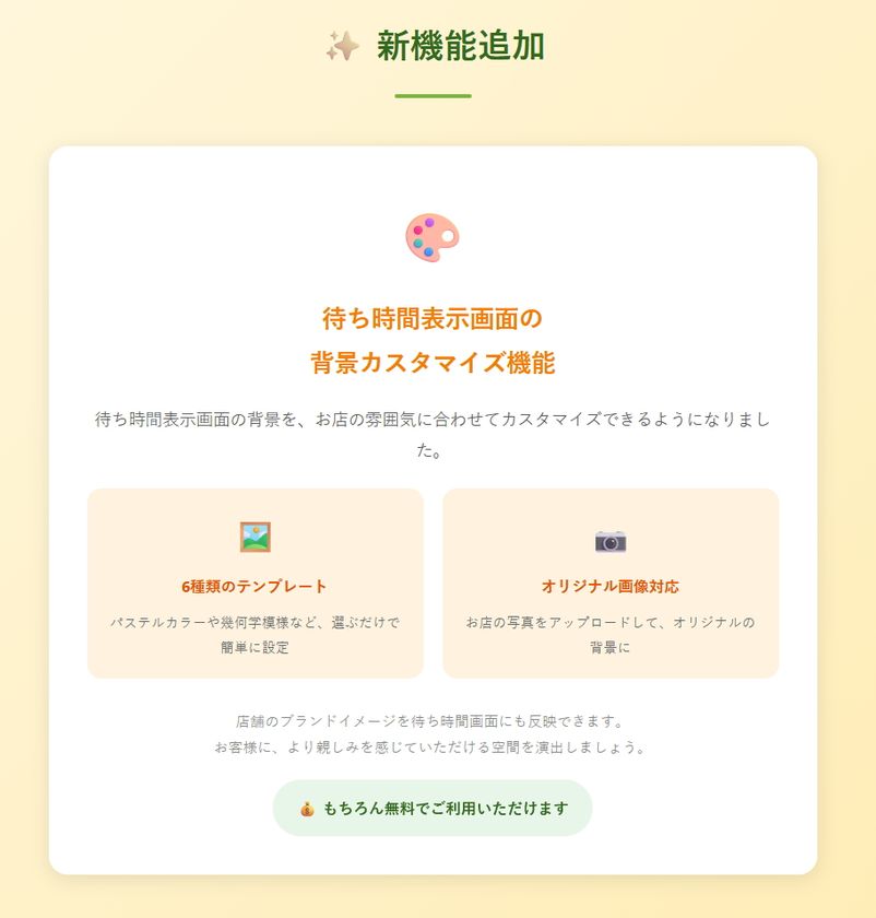 待ち時間表示画面の背景を、店舗様ごとにカスタマイズできます。6種類のテンプレート(パステルカラーのグラデーション3種、ドット・ストライプ・ウェーブの幾何学模様3種)から選択できるほか、店舗様オリジナルの画像をアップロードすることも可能です。アップロード画像には自動でぼかし処理が適用され、待ち時間の視認性を保ちながら店舗の雰囲気を演出できます。