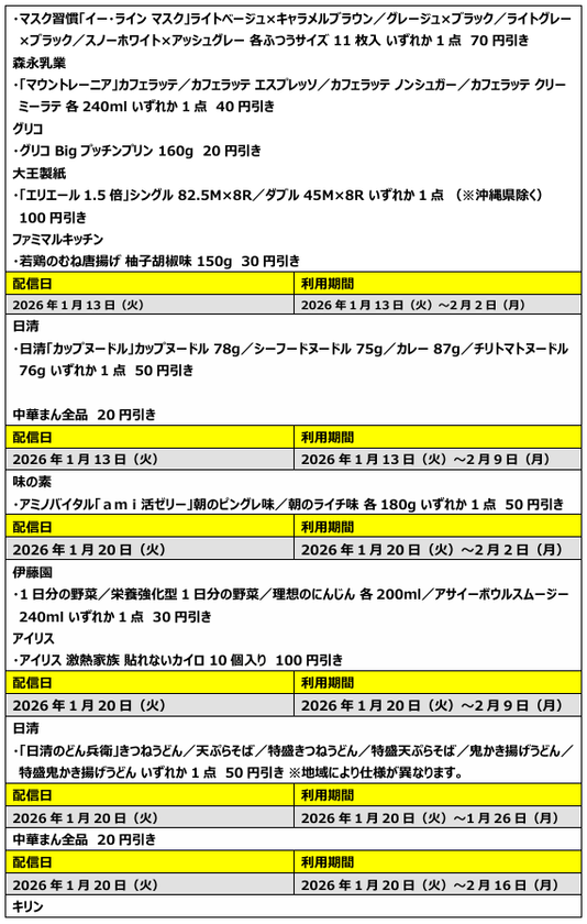 このたび、寒い冬を乗り切る中華まんや風邪対策アイテムのクーポンを2026年1月6日(火)から順次配信いたします。