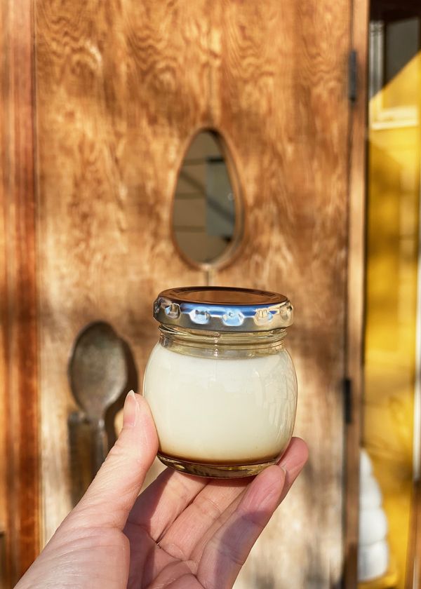 白いミルクプリンの上に松本産山辺ワイナリーのナイヤガラワインを使った香り高いワインジュレをのせました。蓋を開けるとアルプスの山々を思わせるプリンゼリーです。