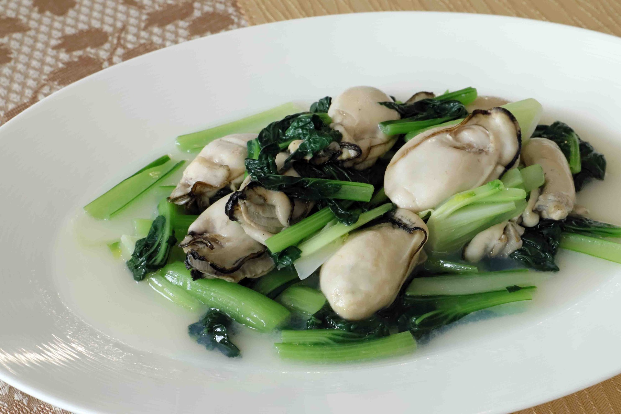 ターサイのシャキッとした歯ごたえと、やさしい青い香りが、牡蠣の風味を引き立てます。