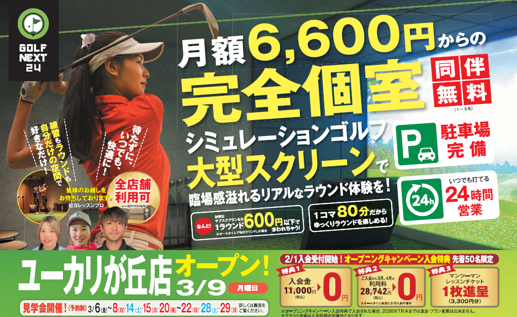 不動産活用事業をはじめ多角的に事業を展開するワイムシェアリング株式会社(東京都新宿区/代表取締役社長 佐藤直史)は、首都圏近郊で展開する完全個室型シミュレーションゴルフブランド「GOLF NEXT 24」の新店舗「GOLF NEXT 24 ユーカリが丘店」を2026年3月9日に千葉県佐倉市ユーカリが丘にオープンいたします。千葉県エリアでは初出店となります。