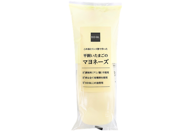 BIO-RALの人気商品「こめ油」と有精卵の平飼いたまご、リンゴ酢を使用したこだわりのマヨネーズ。