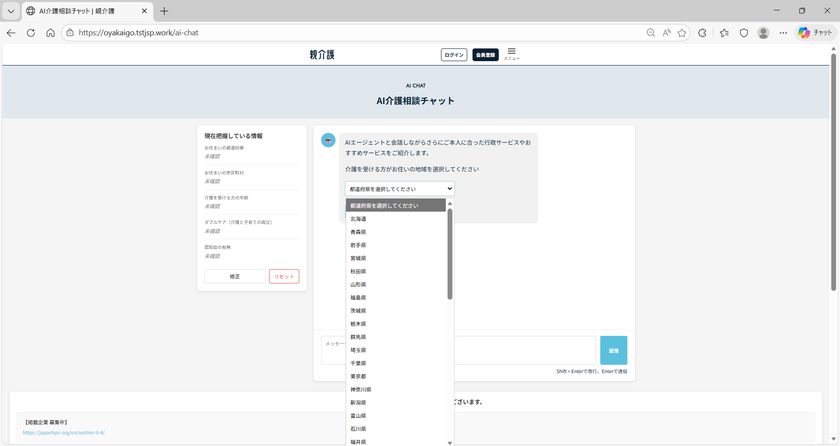 AIチャットでは、親の居住地域や介護状況に応じて、