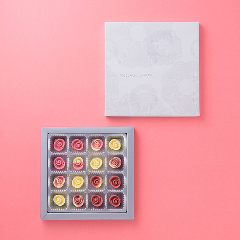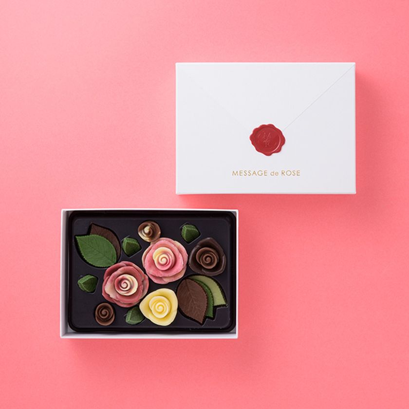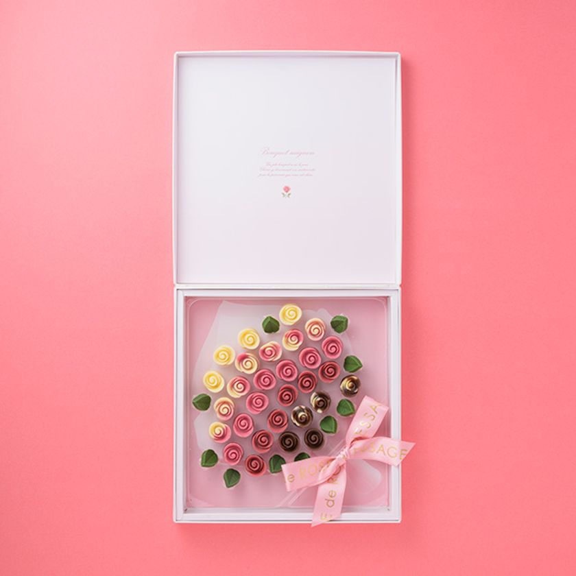 イチゴマーブルが鮮やかな花びらショコラは、メサージュ・ド・ローズならではの技法を用いて表現。