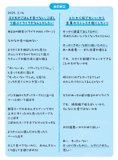 メモ全体を見直してみると、「せっかく」という言葉が3回も書いてあることに気づきました。K さんは、子どもがごはんを食べないことや、服や床を汚されることよりも、「手間ひまかけて一生懸命作ったものをこぼされたりぐちゃぐちゃにされたりして、自分がかけた時間やエネルギーをムダにされた」=「自分がないがしろにされた」と感じることが、いちばんのイライラポイントではないかと気づきました。