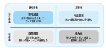 アンゾフの成長マトリクスは、横軸と縦軸という2つの視点から物事を整理する「マトリクス」の一種です。企業が事業をどう成長させるか考える際に、「既存市場と新規市場」と「既存商品と新規商品」の2軸で整理することで、戦略の方向性を明確にできます。
