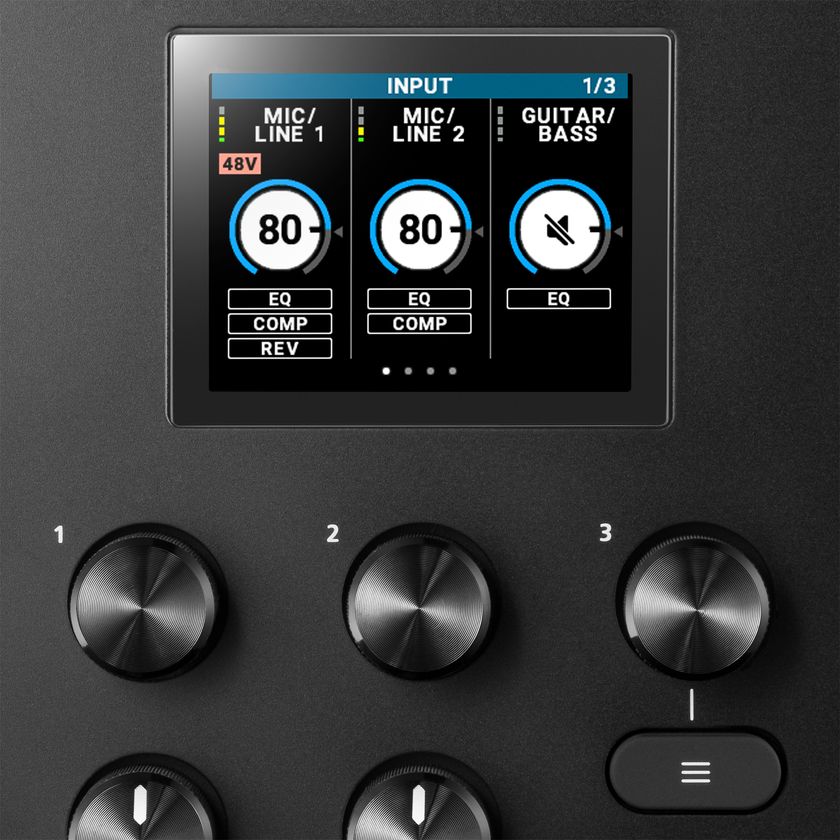 また、これらの豊富な機能を『GO:MIXER STUDIO』単体で直感的に調整できるカラーLCD モニターを内蔵。画面を見ながら、ツマミやボタンを使って細かく調整を行うことができます。さらには、『GO:MIXER STUDIO』で設定したミキシング内容を16個のシーン・メモリーに保存できるので、スタジオでの楽曲制作、屋外でのパフォーマンスなど用途に応じて素早く設定を切り替えることができます。