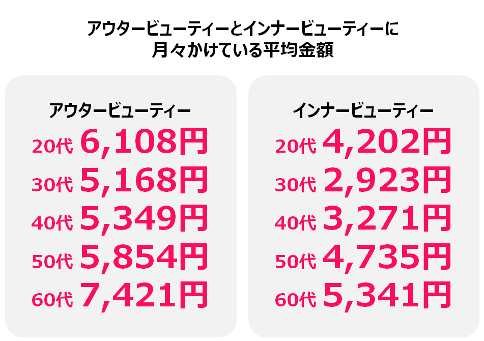 20代~60代までの世代ごとに、アウタービューティーとインナービューティーそれぞれに月々かけている金額を聞いたところ、平均金額はどの年齢層でも1,000円~2,200円ほどアウタービューティーの方が高い結果となりました。インナービューティーは、栄養バランスや生活習慣など、お金をかけずに意識できることも多い中でも、各世代一定の金額を使っているようです。また、若い世代である20代が、50代・60代に次ぐ平均金額となり、メイクやスキンケアといったアウタービューティーだけでなく、内側から美しくなるインナービューティーにも注目し、ある程度お金をかけていることが分かります。