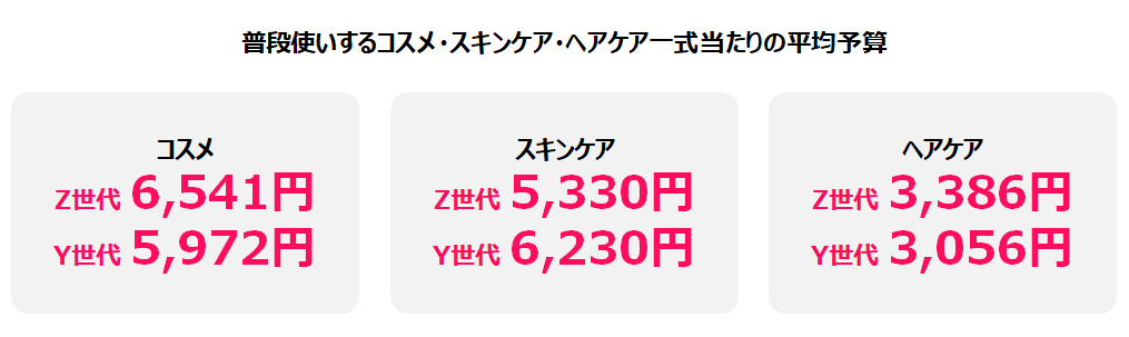 世代別で、普段使いしているコスメ・スキンケア・ヘアケア一式当たりの予算も聞きました。その結果、コスメ一式の平均予算はZ世代が6,541円、Y世代が5,972円、スキンケア一式の平均予算はZ世代が5,330円、Y世代が6,230円でした。Z世代はコスメ、Y世代はスキンケアによりお金をかけていることが分かります。