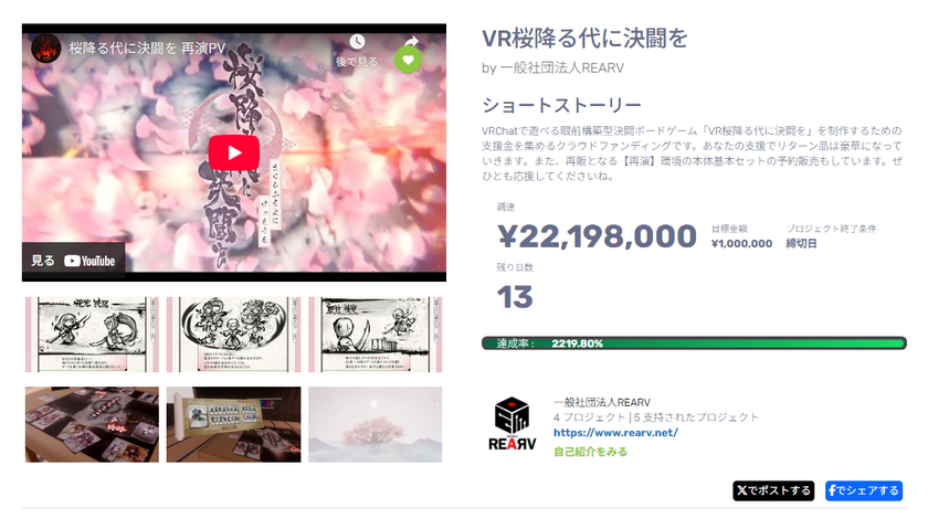 「REALとVRをA:アナログゲームでつなぐ!」を理念とするREARVでは、「桜降る代に決闘を」のクラウドファンディングにより、更なるVRアナログゲームの普及と発展を目指しています。