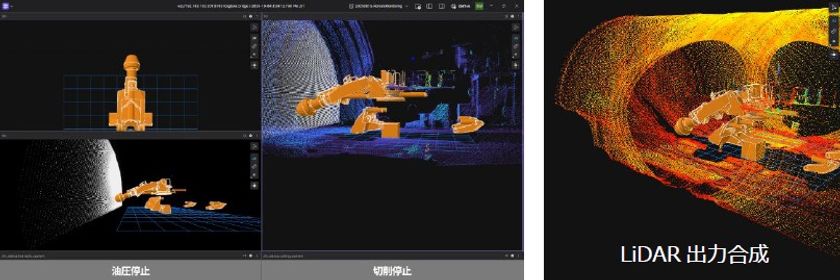 前回の実証試験で得た知見をもとに、トラブル時のポップアップ表示やアラート音など、さらに状況把握が容易になるよう改善を行いました。また、掘削アシストシステム(図2)はLiDARにより取得された周辺データを重ねることができるようになり、AI-ロードヘッダと切羽の詳細な位置関係など、より実態を反映した状況把握が可能となりました。