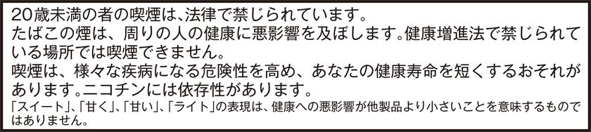 当社は、一般社団法人日本たばこ協会の自主基準に則り広報及び広告活動を行っておりますため、20歳未満の方へのたばこに関する情報発信はお控えいただきますようお願いいたします。また、本リリースを転載・転用いただく際には以下の「健康注意文言」も併せて表示いただきますようお願い申し上げます。