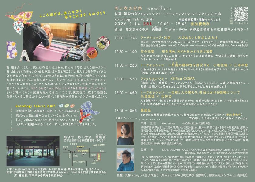 久柳-kuryu-(代表:昌子 久晃)、Office COMA、三浦 祥敬(アーティスト)は、2026年2月14日、京都の寺院「長慶院」にて、衣食住の“衣”に宿る恵みを再発見する1DAYイベント『kotohogi fabric』を開催します。対話・展示・ファッションショー・ワークショップを通して、布が生まれ、衣になるまでに関わる人と時間の価値に触れ直す場をひらきます。