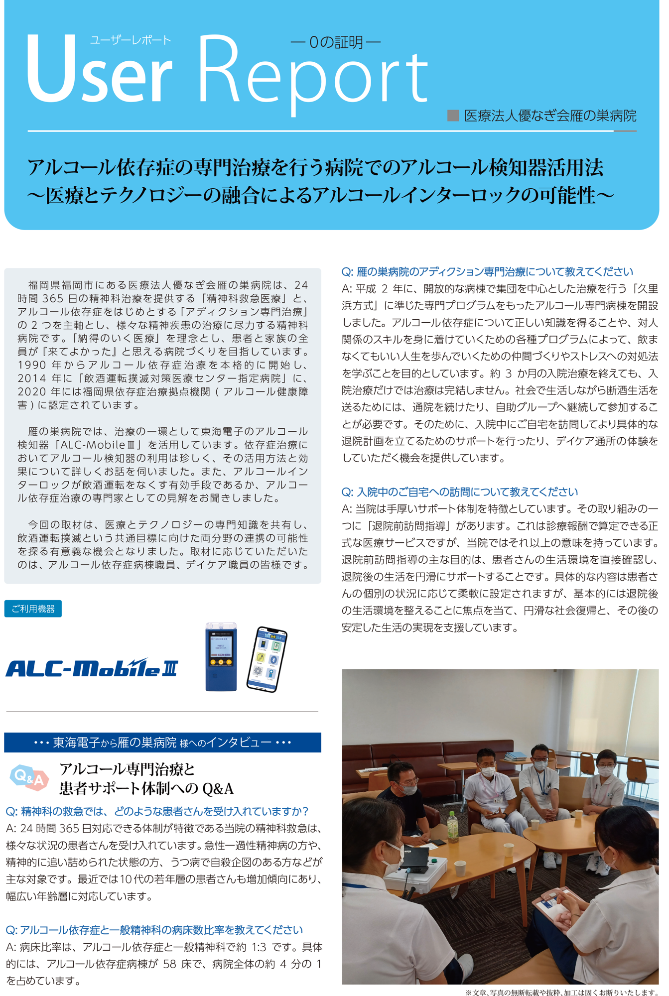 アルコール検知システム、点呼システム、運行管理システム、安全運転管理システムを開発・販売する東海電子株式会社(本社:静岡県富士市 代表取締役:杉本哲也)は、アルコール依存症の専門治療を行う医療機関におけるアルコール検知器の活用事例を取材したユーザーレポートを公開しました。
