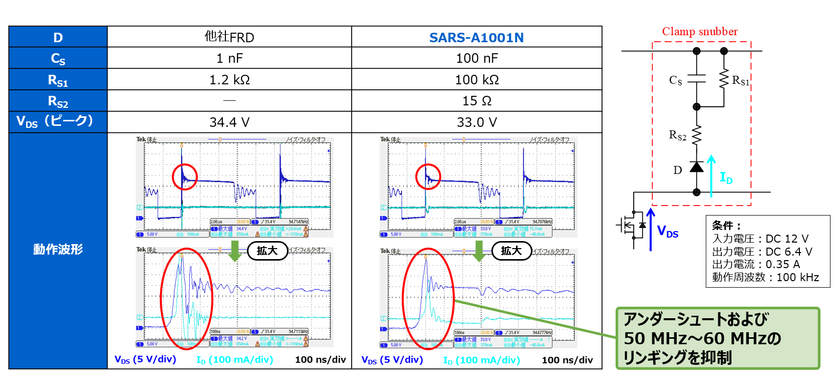 SARS-A1001Nを使用したクランプスナバ回路は、一般的な高速整流ダイオード(FRD)を使用したクランプスナバ回路に比べ、リンギングが小さくスイッチングノイズの抑制が可能です。