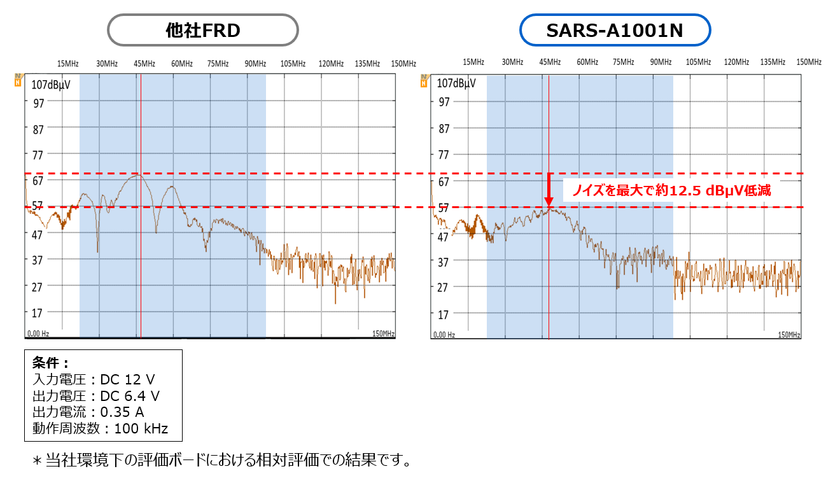SARS-A1001Nを使用することで、20 MHz~100 MHz付近の放射ノイズ低減を確認できました。