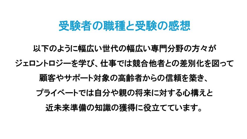 日本応用老年学会より「ジェロントロジー・コンシェルジュ(R)」に認定され、名刺の肩書にその名称を入れることが許可されます。また、高齢社会に資するほかの専門知識を修得されている方は、日本応用老年学会に登録申請をすることで、「ジェロントロジー・マイスター」の資格が付与されます。