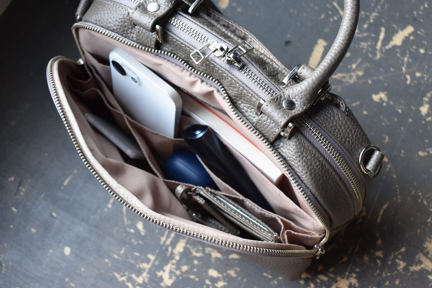 iPad mini、スマートフォン、文庫本、ペン類、化粧小物などを整理しやすく、バッグインバッグを使わずにすっきり収まります。