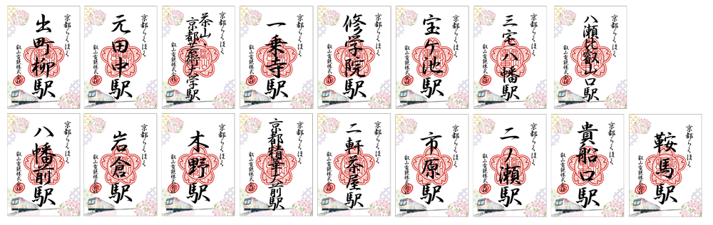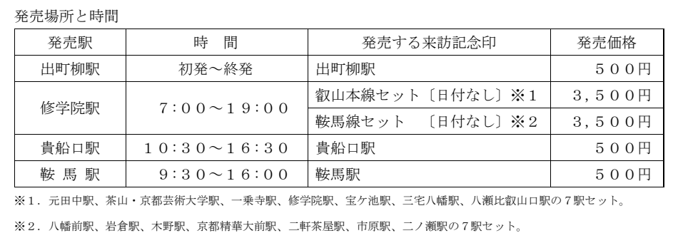 また、叡山電車の出町柳駅、修学院駅、貴船口駅、鞍馬駅の4駅にて乗車記念として同企画の限定台紙を使用したご朱印風「来訪記念印」(枚数限定)を発売します。