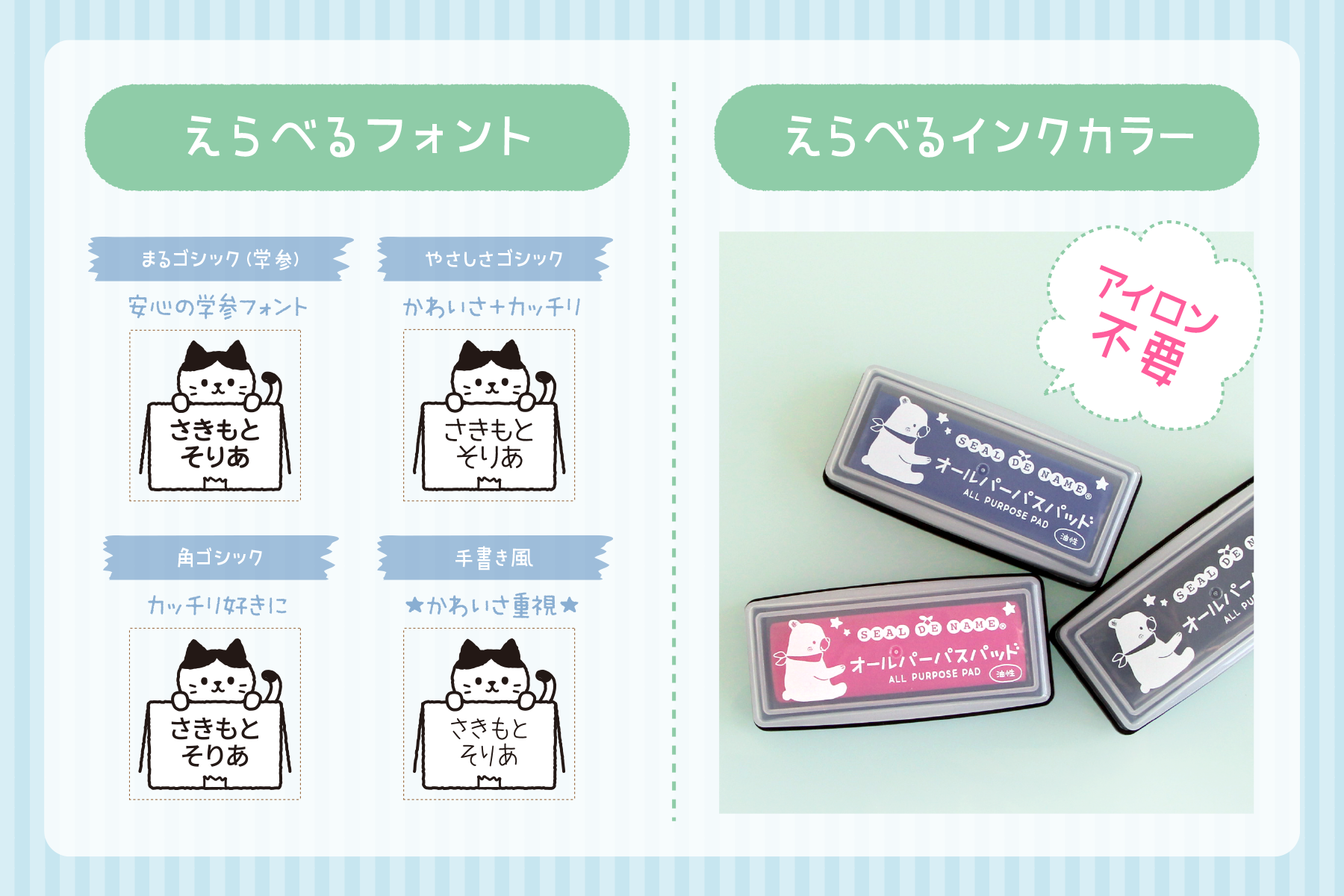 学参・旧字に対応した「丸ゴシック」からかわいい「手書き風」まで、全4種類のフォントから選ぶことができます。また、ひらがなだけではなく漢字やローマ字にも対応。付属のインクカラーも3色ご用意しておりますので、洗濯タグで目立つよう「ブルー」や「ピンク」のセレクトもオススメです。