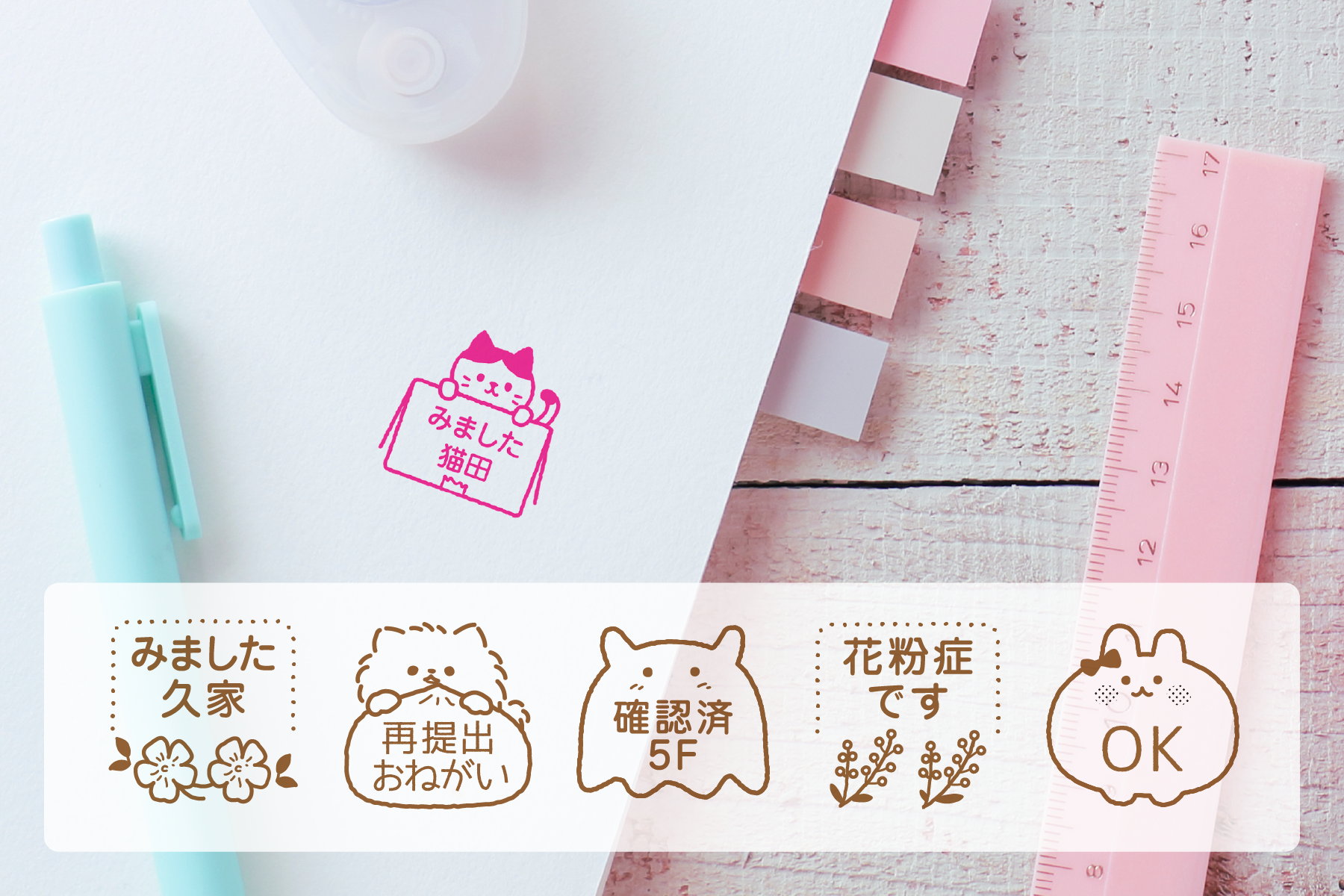 学校や塾の先生が使用する「確認済」「再提出」スタンプなど、お名前のみではなく使い方次第でさまざまなシーンでご利用いただけます。